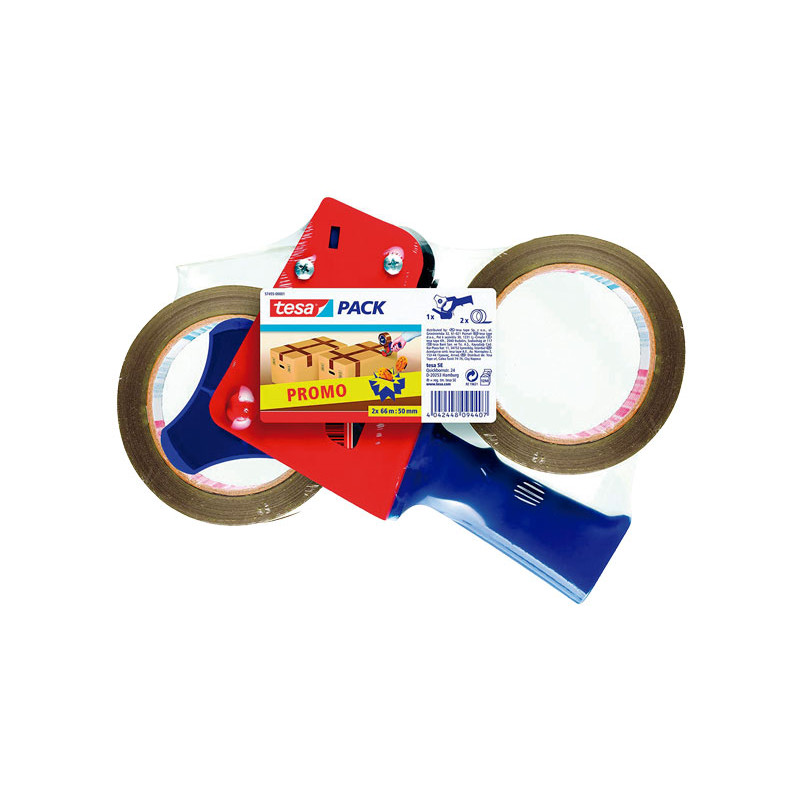 Portarrollos metálico con empuñadura ABS ergonómica, para ancho máximo de la cinta de 50mm. Con sistema de freno y corte. Con 2 rollos de regalo de 50mmx66m.